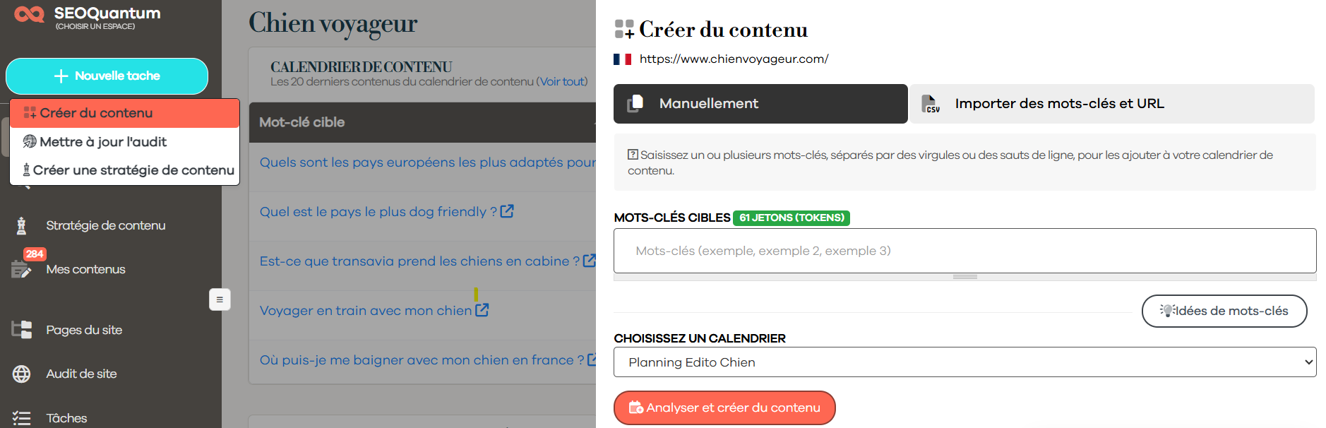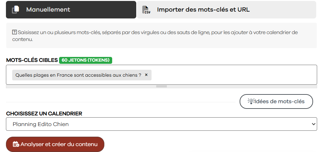 Entrez le mot-clé sur lequel vous souhaitez vous positionner dans l'encart Mots-clés Cibles et cliquer sur Analyser et créer du contenu.