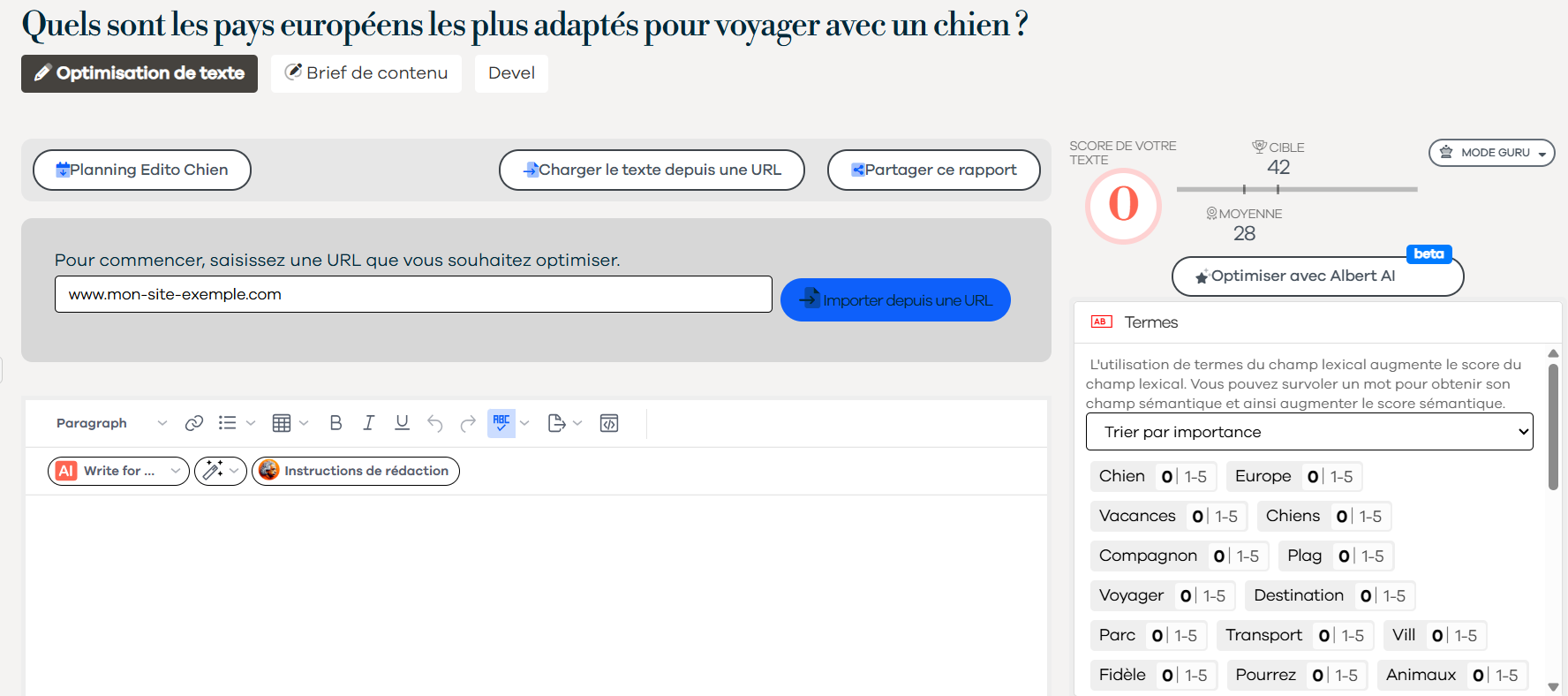 - Score de votre contenu : Quel est votre score actuellement, la note se base sur 3 éléments Le champ lexical - Le champ sémantique - La lisibilité